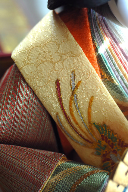 日本の色には十二単(じゅうにひとえ)のように色を襲る(かさねる)色彩美があります。「襲色目」という手法で、衣の表裏や織り糸によって色を襲ね、桜の襲、菖蒲の襲、紅葉の襲などの名前をつけて、四季折々の風情を表現しました。