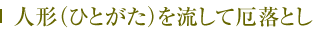 人形(ひとがた)とは、人の形を模した紙の形代(かたしろ)です。人形に自分の名前や年齢などを書き、それで体を撫でて人形に罪やケガレを移し、身代わりとして神社に納めます。人形を川に流したり、篝火を焚いたり、水や火を使う神事で清め、厄を落とします。