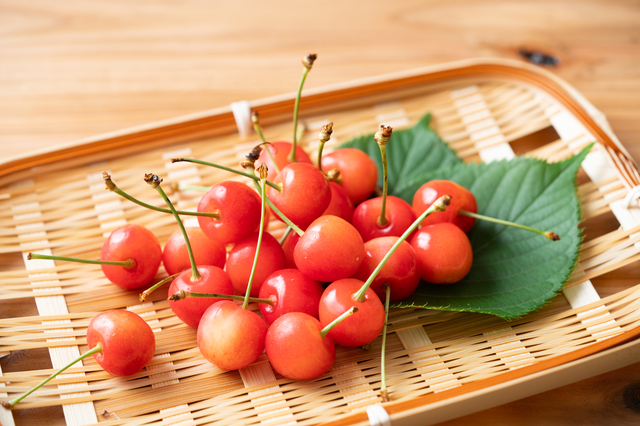 今、一番人気で知名度が高いのは「佐藤錦(さとうにしき)」。大正時代に山形県東根市の佐藤栄助氏が育成した品種で「ナポレオン」と「黄玉」の交雑種といわれています。つやつやと赤く、甘くて酸味もほどよい美味しいさくらんぼです。佐藤錦の旬は6月下旬から7月初旬の2種間前後。旬の時期を逃さず味わいたいですね。