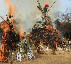 小正月に正月飾りや書き初めを燃やす行事で、その煙に乗って年神様が天上に帰ってゆくとされています。「左義長」は、三毬杖(さぎちょう)という青竹で正月飾りを焼いたことに由来しますが、「どんど焼き」「とんど」とも呼ばれ、その火で焼いたお餅などを食べると無病息災で過ごせるといわれています。